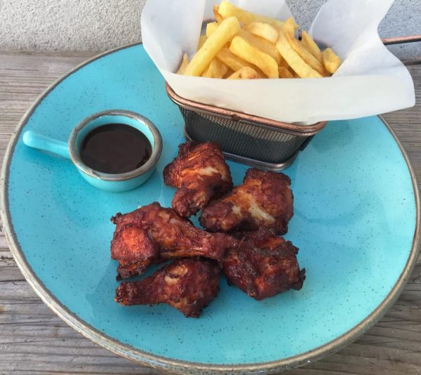 Ingrediente: 5 aripioare pui marinate* (200g), cartofi prăjiţi (150g), sos barbeque (30g)